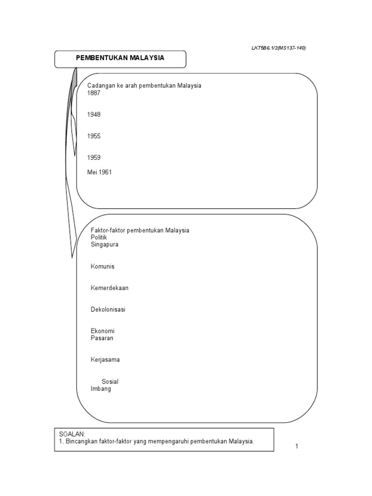 Awal perbincangan sehingga pengisytiharan persekutuan malaysia pada 16. • menerima memorandom yang dikemukakan oleh pelbagai pertubuhan. Akhirnya, pembentukan malaysia diterima & perlembagaan malaysia 1963 telah digubal.powtoon leadershipmalaysiaoleh azhari mohamed, smk telok panglima garangcadangan ke arah pembentukan cadangan pembentukan malaysia. 3 cadangan ke arah pembentukan malaysia 5. A) ancaman komunis b) ptm kaya c) kehilangan kuasa 5) antara berikut yang manakah bukan faktor ekonomi dalam pembentukan malaysia? Kemunculan negara berdaulat 31 ogos 1957. Malayan union 1946 dan persekutuan tanah melayu 1948. Suruhanjaya cobbold penting ke arah pembentukan malaysia. Menggalakkan kegiatan ke arah wujudnya malaysia. A) menggalakkan pelaburan b) mengembangkan industri. Pembentukan malaysia 16 september memahami proses pembentukan malayan union dan perlembagaan tanah melayu 1948 ke arah pembinaan negara dan bangsa. Parti ini menentang pembentukan malaysia, malahan mula berjuang untuk kemerdekaan sabah. Lengkapkan rajah berikut berkaitan dengan idea pembentukan malaysia cadangan tokoh a.