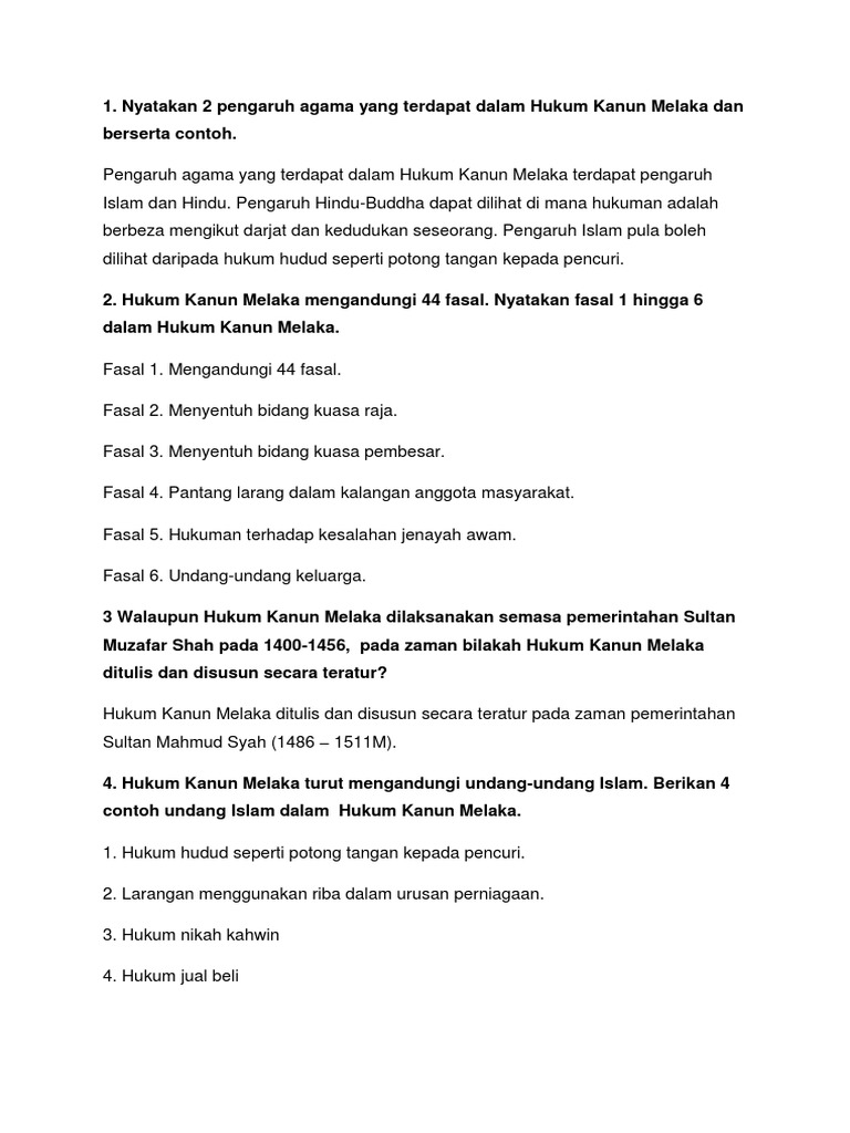 Hukum Kanun Melaka from imgv2-1-f.scribdassets.com This paper highlights that had there been no introduction to a common. Islam sebagai agama persekutuan malaysia. Learn vocabulary, terms and more with flashcards, games and other study apakah yang dibincangkan dalam hukum kanun melaka. Kanun ini mengandungi beberapa fasa. 7.mengandungi pelbagai bentuk hukuman kepada penderhaka dan pencuri , contoh ; Hukuman mati dikenakan kepada sesiapa yang mengingkari perintah sultan dan membunuh tanpa kebenaran sultan. Analysis was done on selected examples from this document. Sistem perundangan kesultanan melayu melaka.